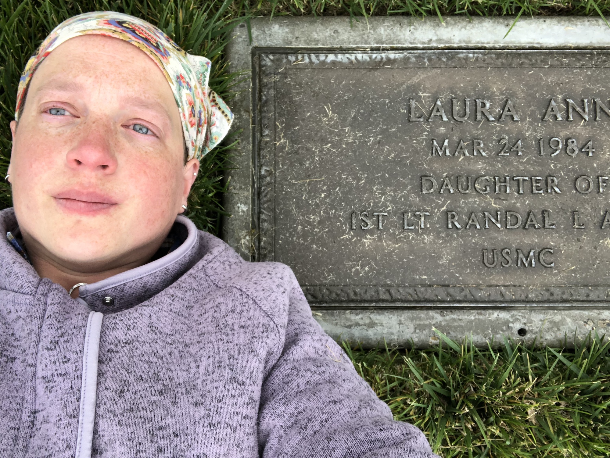 a person laying next to a headstone with the words "Laura Ann March 24 1984. Daughter of 1st Lt. Randal L. Alger, USMC"