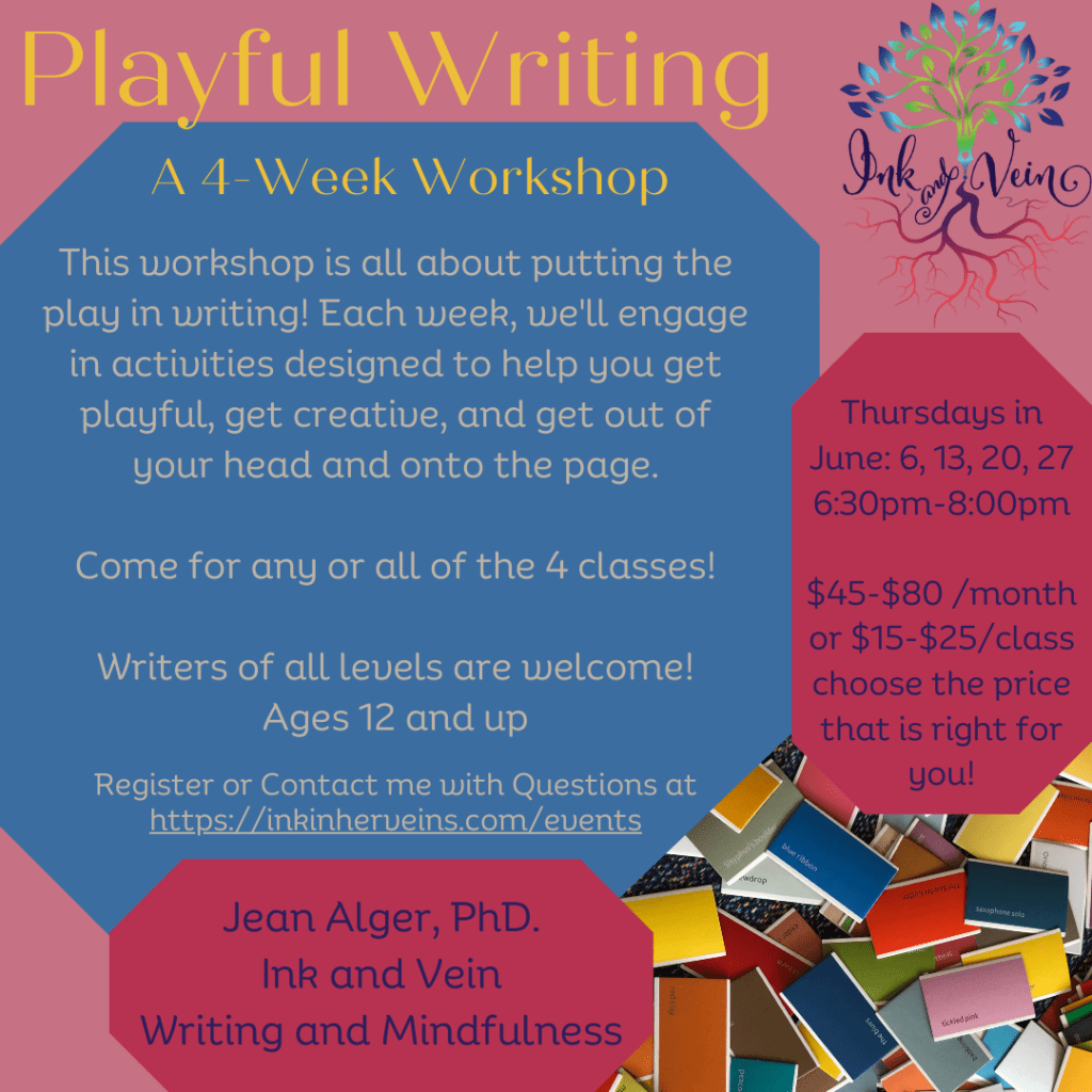The workshop will be 90 minutes each week; you can come to any or all of the sessions, and each one will offer something new and playful to try. Each session will be a low-pressure period for completing guided writing activities with opportunities (but no requirement) to share ideas and writing with each other. This is not a workshop where you will receive critique. It is a workshop where you will receive encouragement and support.