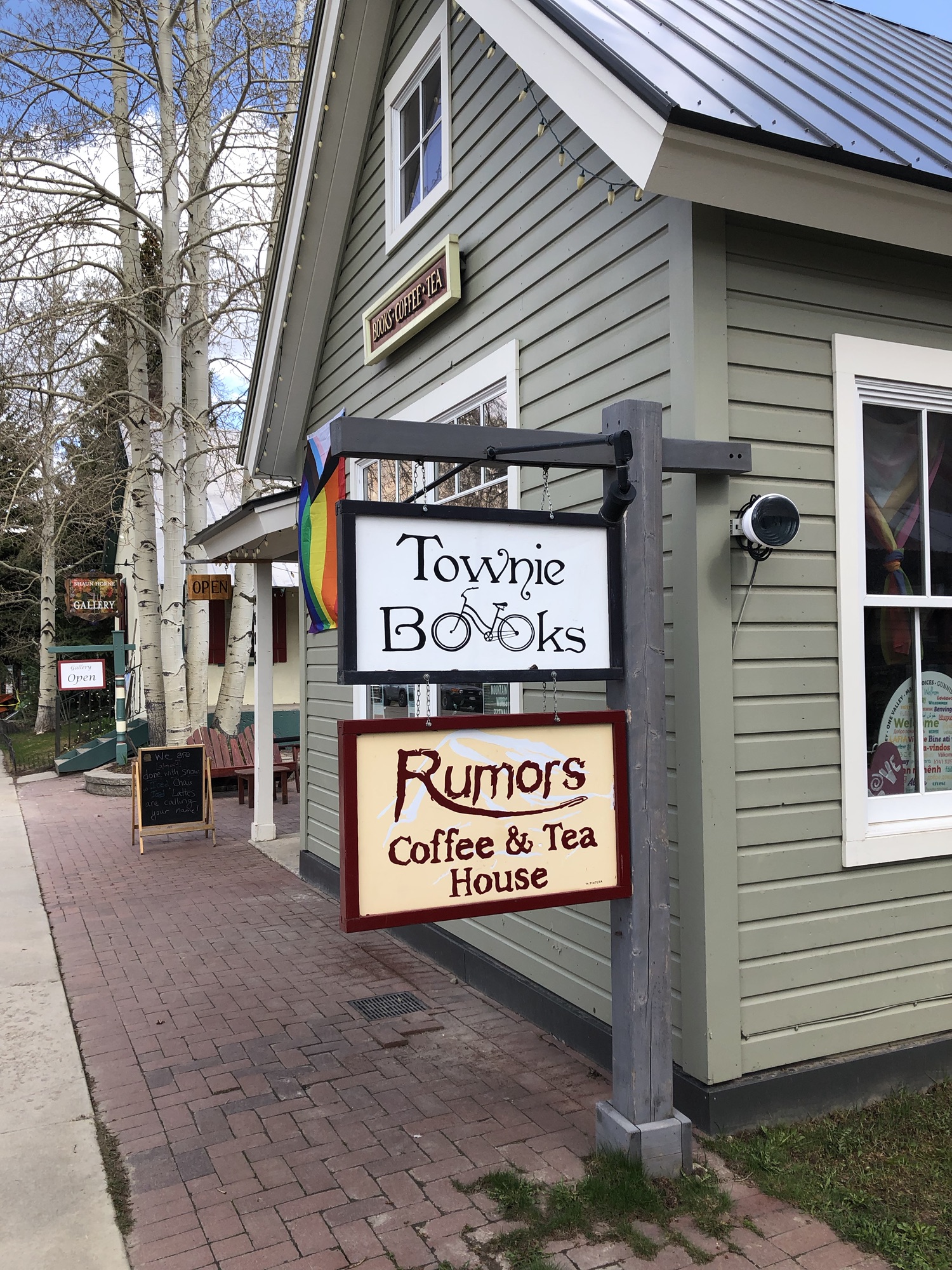 image of a double hanging sign outside a green building. The top sign reads "Townie Books" and the bottom sign reads "Rumors Coffee and Tea House"