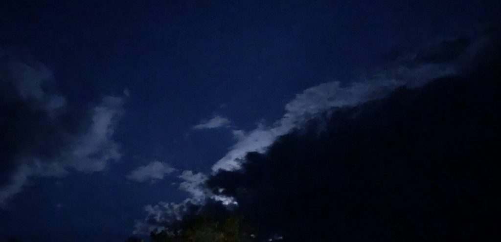 So 10pm found me on a dark trail amidst the trees, the air humid and slightly warm. The nearly full moon shone her light, sometimes illuminating sky from behind dark clouds, sometimes fully visible. Light rain pattered down on the dirt trail, releasing the scent of trees and dirt.
